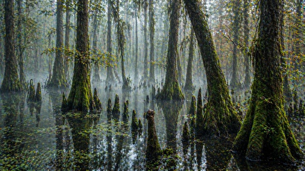 Этот лес частично находится под водой. Деревья растут прямо из болот, покрытые мхом, создавая атмосферу туманных, почти сказочных пейзажей.