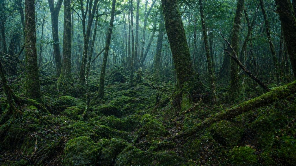 Этот лес у подножия Фудзи известен своей густотой и необычной тишиной. Из-за плотной растительности и лавовых пород звуки здесь почти не распространяются, создавая ощущение изоляции от внешнего мира.