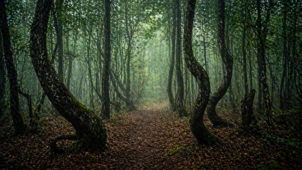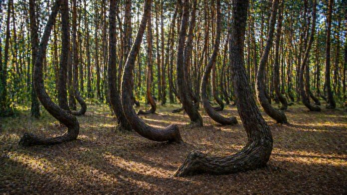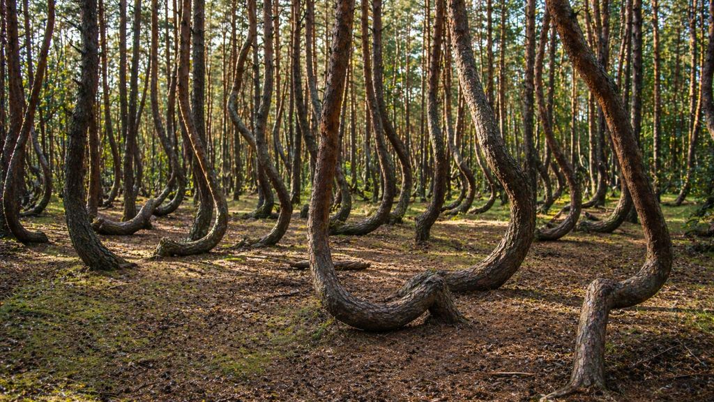 Деревья в этом лесу искривлены в кольца и спирали, будто их кто-то специально закручивал. Причины до конца не ясны, что добавляет месту загадочности.