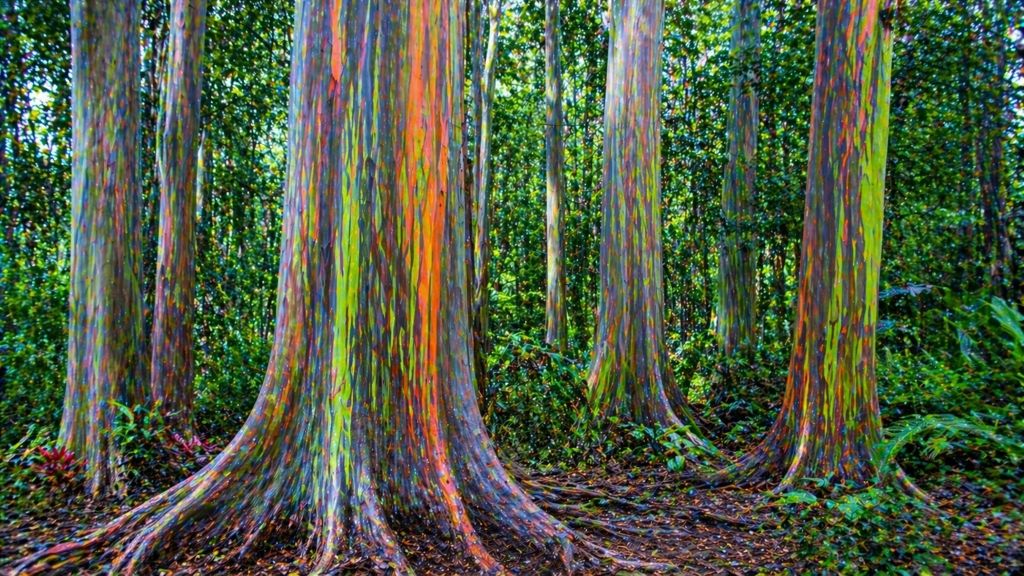 Стволы этих деревьев окрашены в яркие разноцветные полосы. Сочетание зелени и радужной коры создаёт почти нереальный визуальный эффект.