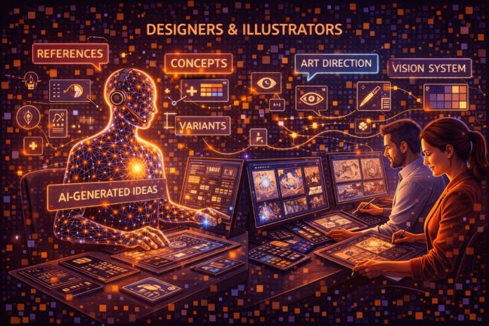 Нейросети ускоряют поиск референсов, варианты композиций и визуальные концепты. Ряд простых задач (баннеры, иконки, черновые иллюстрации) частично уйдёт в автоматизацию. Зато вырастет роль арт-дирекшна, смысла и умения выстроить целостную визуальную систему.