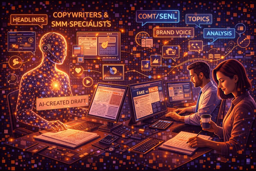 Генеративный ИИ может быстро делать черновики текстов, постов и заголовков. Ценность человека уходит в сторону отбора тем, факчека, глубины и уникального голоса бренда. Рутинный контент будет писаться машинами, а экспертный — усиливаться ими.