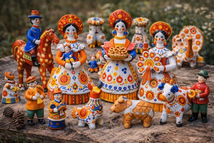 Глиняные свистульки и фигурки из слободы Дымково под Вяткой известны как минимум с XV–XVI веков и связаны с весенним праздником «Свистунья». Постепенно обрядовые фигурки животных и всадников превратились в ярко раскрашенные игрушки — барышень, нянек, всадников и целые композиции. В XX веке промысел был почти утрачен, но возрождён артелью и сегодня считается одним из классических русских сувениров.