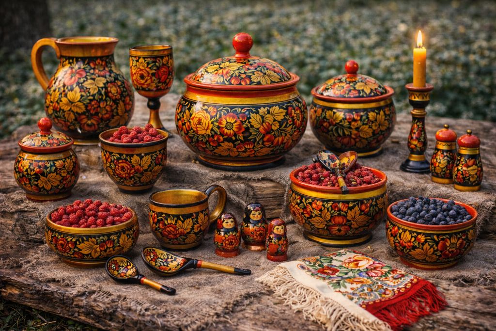 Хохлома появилась во второй половине XVII века в волжских сёлах Нижегородской губернии и получила название по торговому селу Хохлома. Мастера расписывали деревянную посуду и мебель красными и чёрными узорами по «золочёному» фону, имитируя дорогой металлический посудный ряд. Промысел вырос из традиций старообрядческих мастерских и стал одной из самых узнаваемых «золотых» марок русской декоративной классики.
